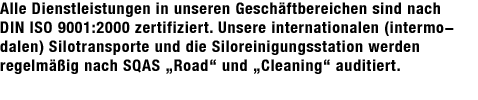 Unter Qualität verstehen wir nicht nur die Anforderungen der Kunden mindestens zu erfüllen, sondern zudem hohe Flexibilität, Zuverlässigkeit und Verfügbarkeit unserer Leistungen zu gewährleisten. Wirtschaftliche Ziele verfolgen wir unter gleichwertiger Beachtung von Sicherheit, Gesundheit und Umwelt.